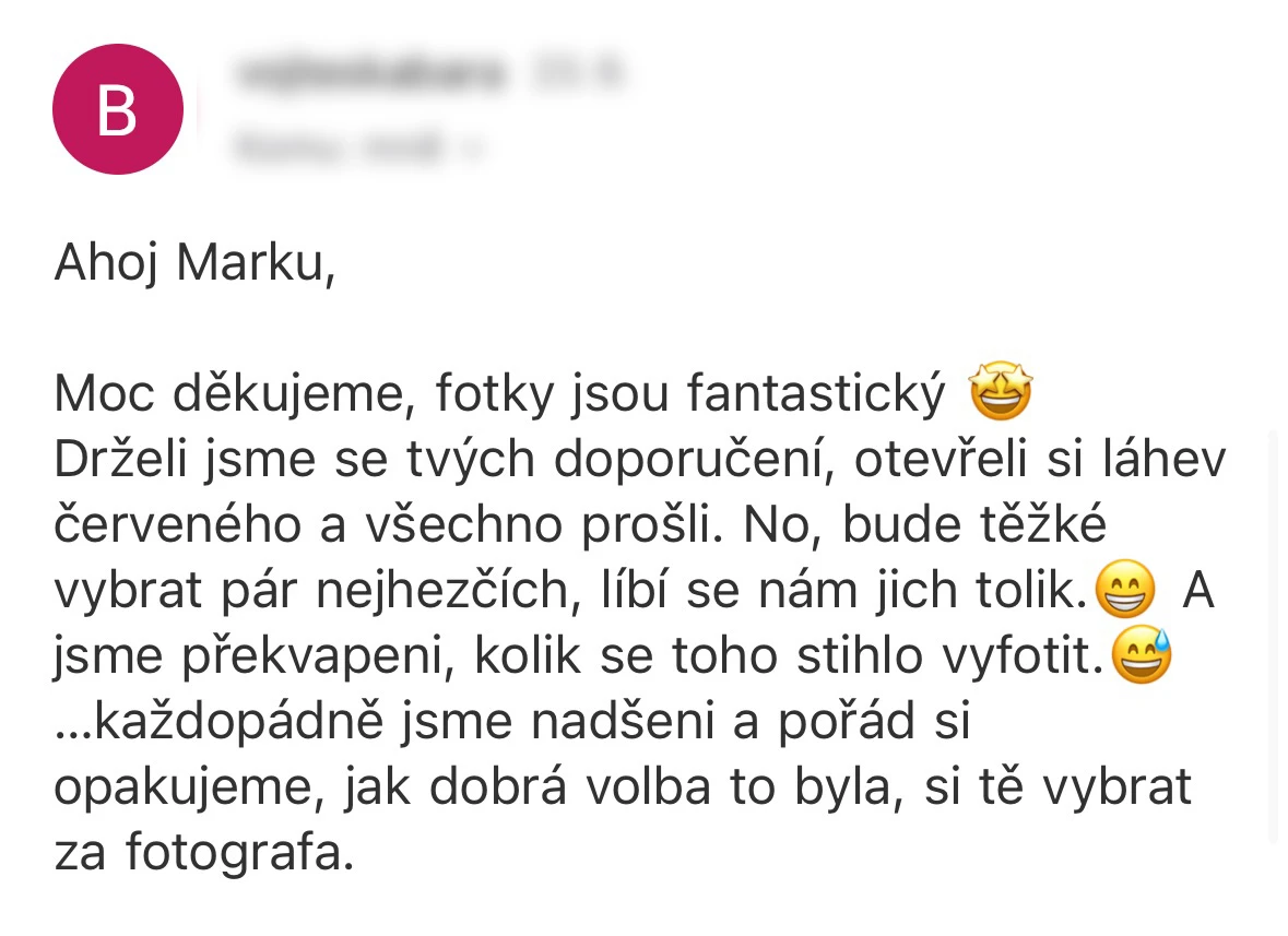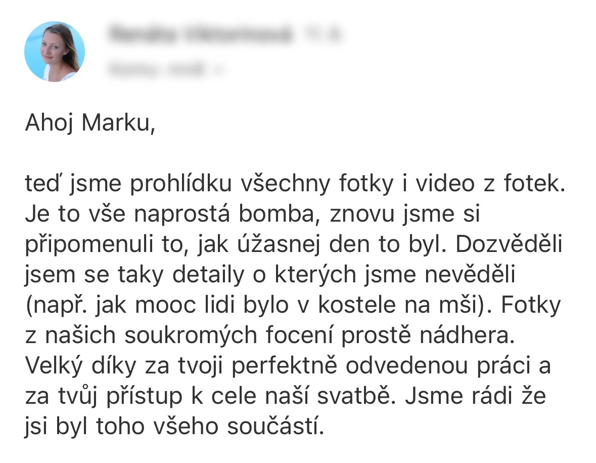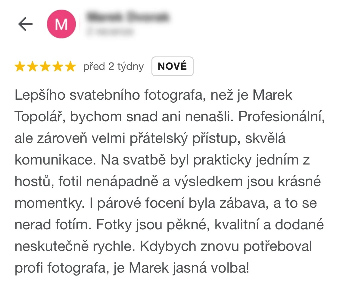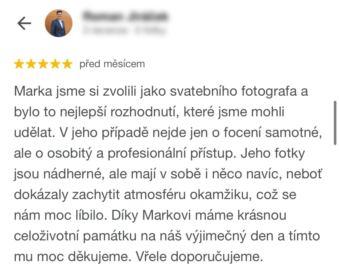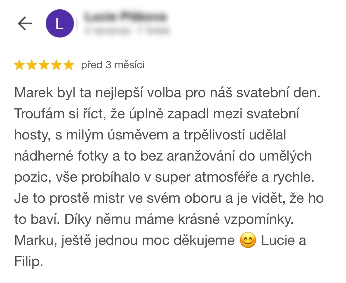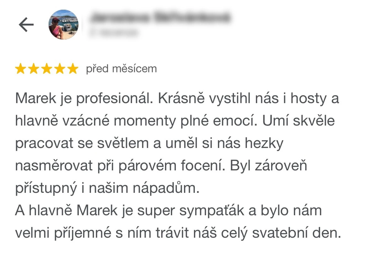 Vybrat si Marka jako fotografa naší svatby bylo jedno z nejlepších rozhodnutí, které jsme mohli pro náš den D udělat. Před svatbou jsme si dali schůzku, abychom věděli, co od sebe vzájemně čekat. Těsně před svatbou nám ještě Marek zaslal podrobný dotazník, aby fotky co nejvíce přizpůsobil našim představám a očekáváním. Zároveň nám pomohl s harmonogramem svatby. Jeho fotky jsou naprosto úchvatné – dokonale zachytily nejen každý důležitý okamžik, ale i drobné detaily a emoce, které bychom jinak možná přehlédli. Díky jeho talentu a citu pro moment máme vzpomínky, které si budeme uchovávat celý život. V den svatby byl Marek neuvěřitelně milý, profesionální a zároveň nenápadný – všichni hosté si ho chválili a cítili se před jeho objektivem přirozeně. Jsme mu nesmírně vděční za to, jak krásně náš den zachytil, a můžeme ho s čistým svědomím doporučit každému, kdo touží po fotografiích s duší. Fotky byly velmi rychle zpracované, již den po svatbě jsme měli první ochutnávku fotek. Ještě jednou moc děkujeme za vše!