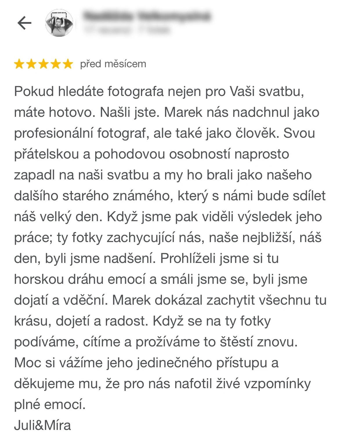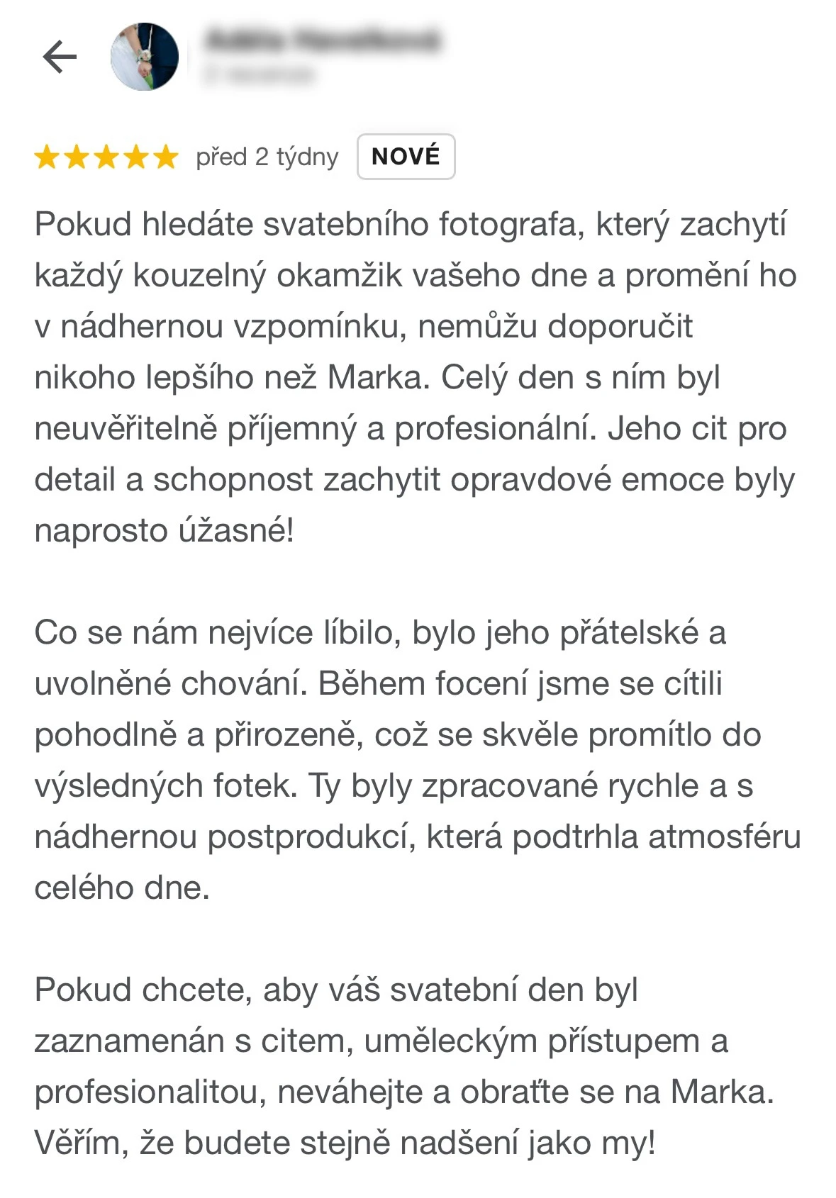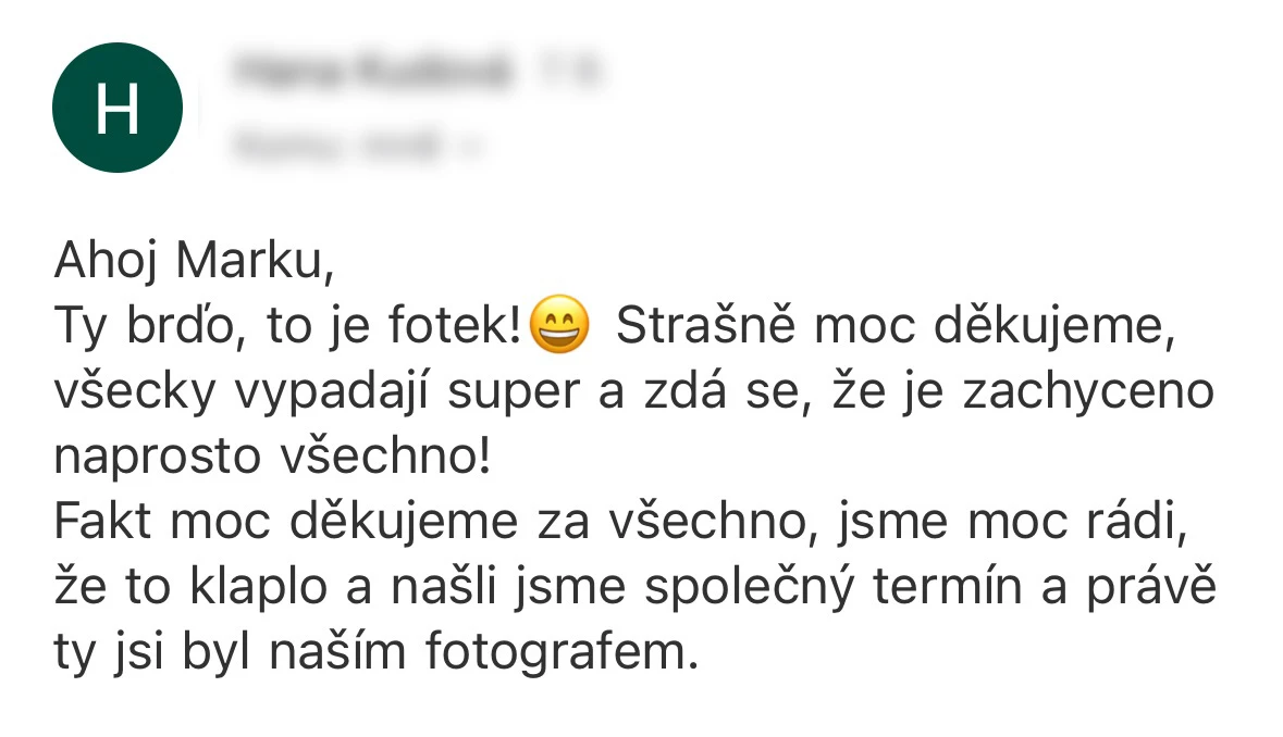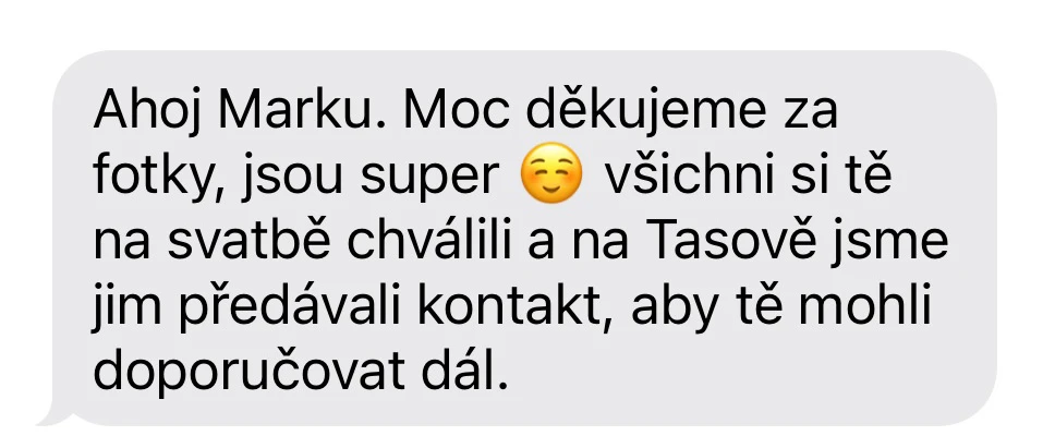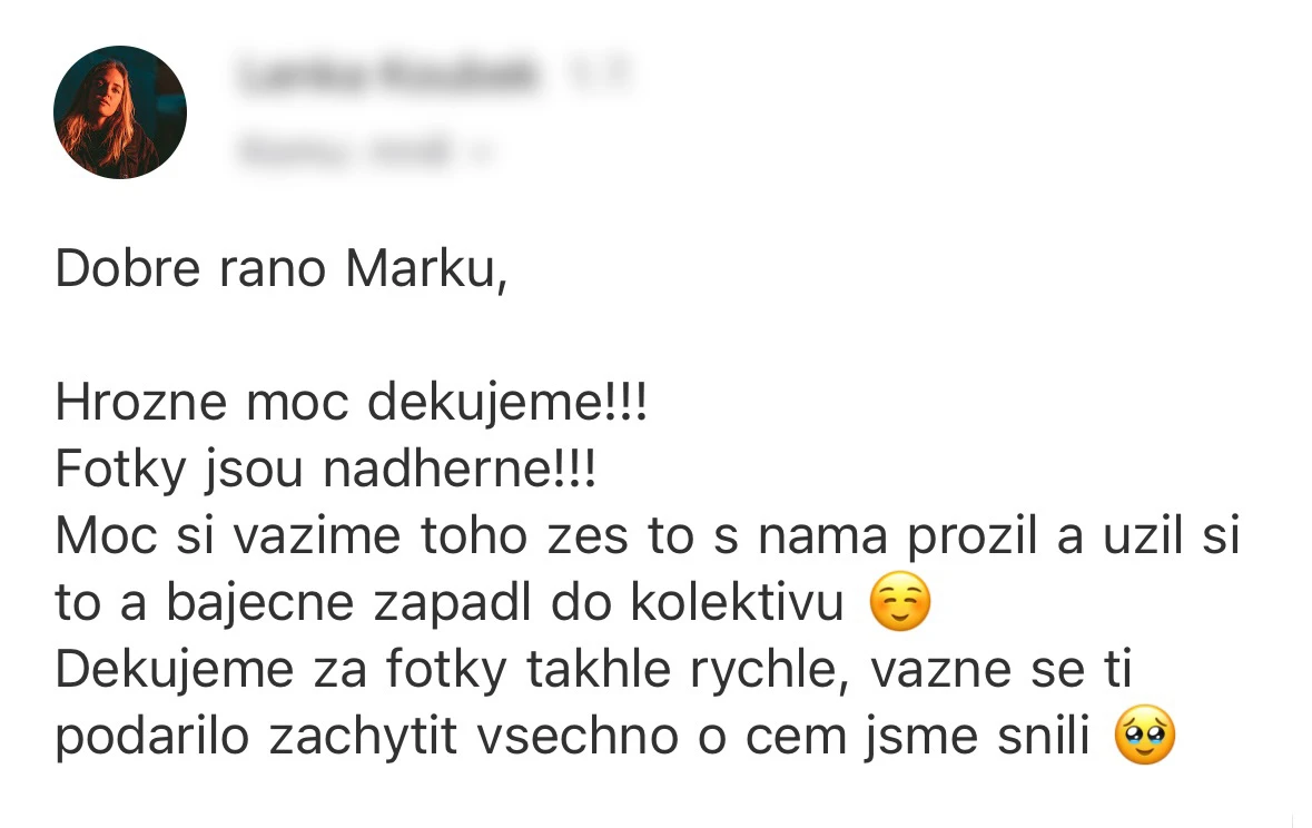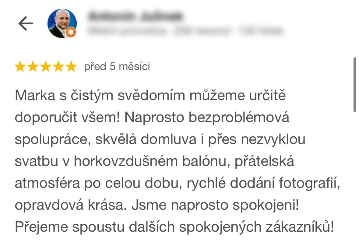 Vybrat si Marka jako fotografa naší svatby bylo jedno z nejlepších rozhodnutí, které jsme mohli pro náš den D udělat. Před svatbou jsme si dali schůzku, abychom věděli, co od sebe vzájemně čekat. Těsně před svatbou nám ještě Marek zaslal podrobný dotazník, aby fotky co nejvíce přizpůsobil našim představám a očekáváním. Zároveň nám pomohl s harmonogramem svatby. Jeho fotky jsou naprosto úchvatné – dokonale zachytily nejen každý důležitý okamžik, ale i drobné detaily a emoce, které bychom jinak možná přehlédli. Díky jeho talentu a citu pro moment máme vzpomínky, které si budeme uchovávat celý život. V den svatby byl Marek neuvěřitelně milý, profesionální a zároveň nenápadný – všichni hosté si ho chválili a cítili se před jeho objektivem přirozeně. Jsme mu nesmírně vděční za to, jak krásně náš den zachytil, a můžeme ho s čistým svědomím doporučit každému, kdo touží po fotografiích s duší. Fotky byly velmi rychle zpracované, již den po svatbě jsme měli první ochutnávku fotek. Ještě jednou moc děkujeme za vše!