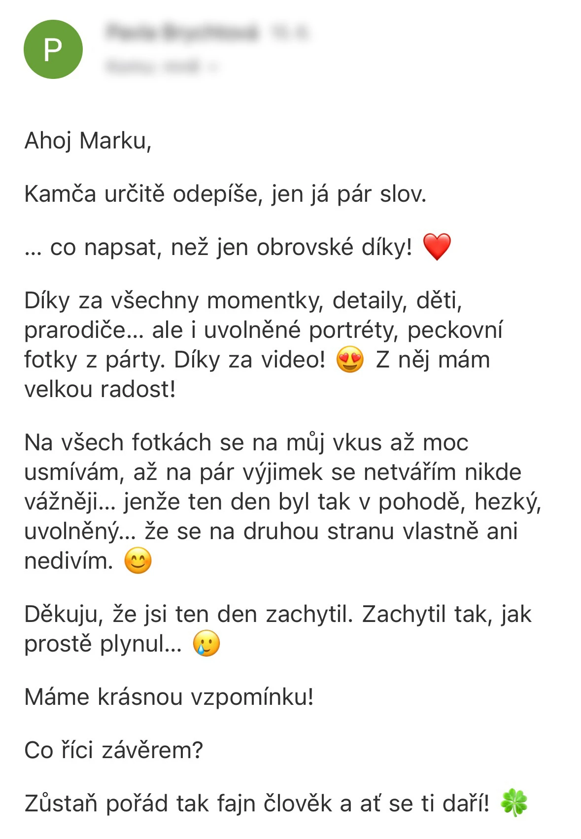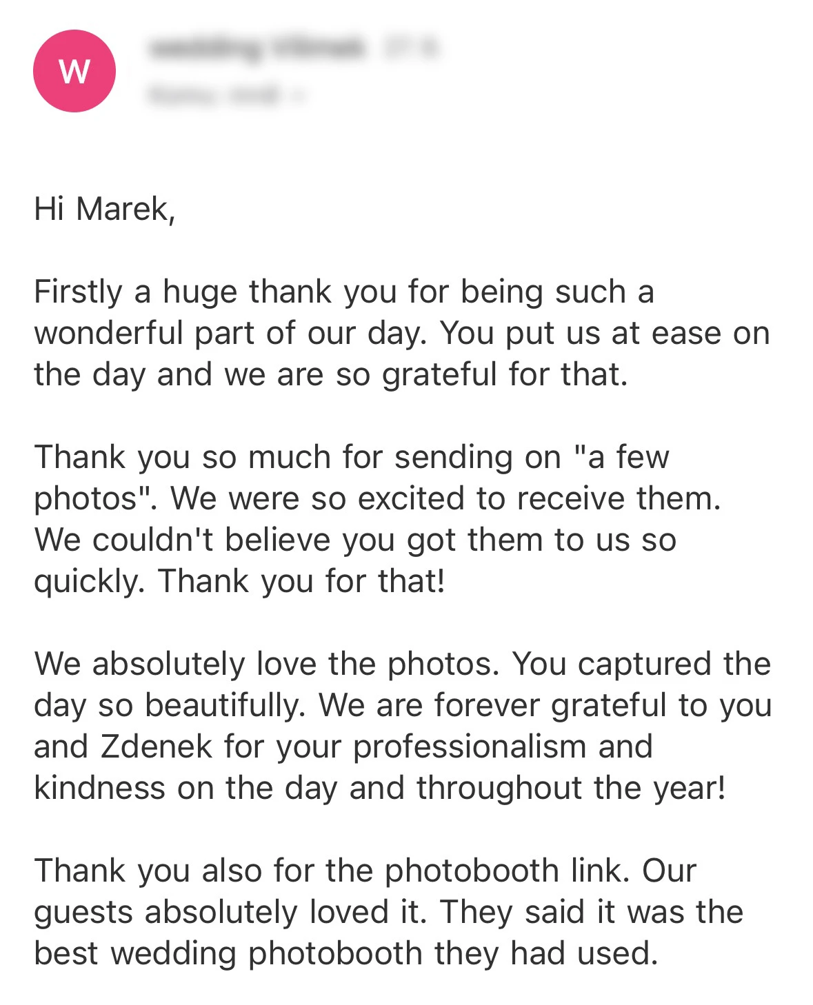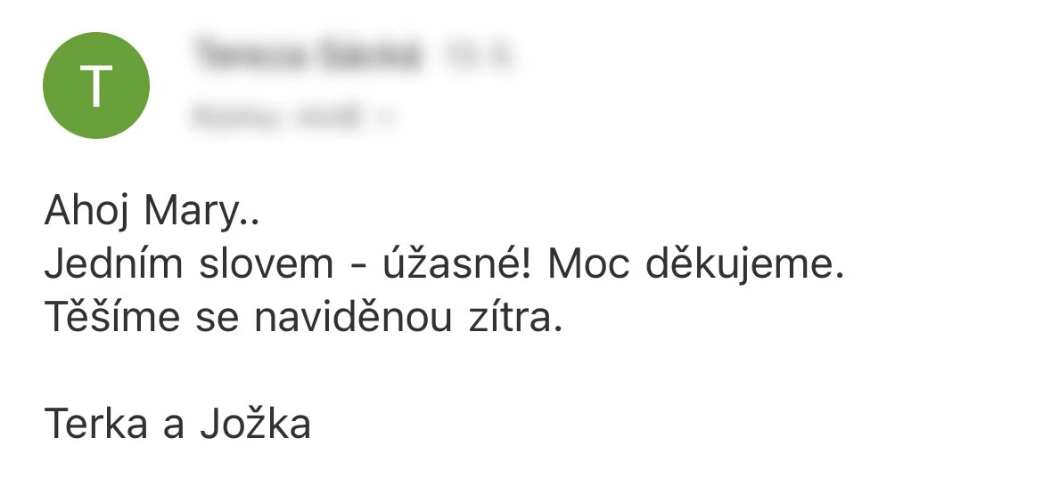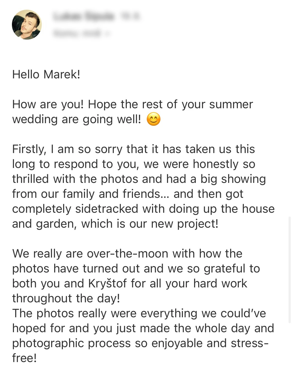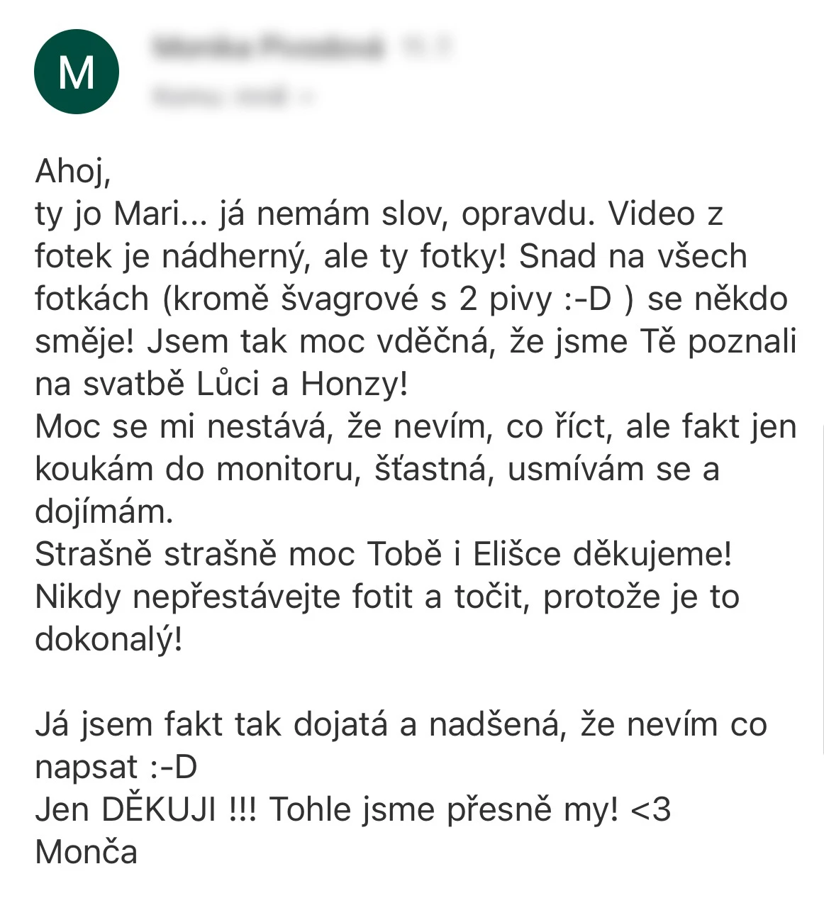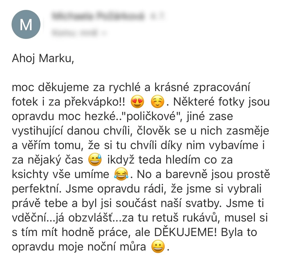 Vybrat si Marka jako fotografa naší svatby bylo jedno z nejlepších rozhodnutí, které jsme mohli pro náš den D udělat. Před svatbou jsme si dali schůzku, abychom věděli, co od sebe vzájemně čekat. Těsně před svatbou nám ještě Marek zaslal podrobný dotazník, aby fotky co nejvíce přizpůsobil našim představám a očekáváním. Zároveň nám pomohl s harmonogramem svatby. Jeho fotky jsou naprosto úchvatné – dokonale zachytily nejen každý důležitý okamžik, ale i drobné detaily a emoce, které bychom jinak možná přehlédli. Díky jeho talentu a citu pro moment máme vzpomínky, které si budeme uchovávat celý život. V den svatby byl Marek neuvěřitelně milý, profesionální a zároveň nenápadný – všichni hosté si ho chválili a cítili se před jeho objektivem přirozeně. Jsme mu nesmírně vděční za to, jak krásně náš den zachytil, a můžeme ho s čistým svědomím doporučit každému, kdo touží po fotografiích s duší. Fotky byly velmi rychle zpracované, již den po svatbě jsme měli první ochutnávku fotek. Ještě jednou moc děkujeme za vše!