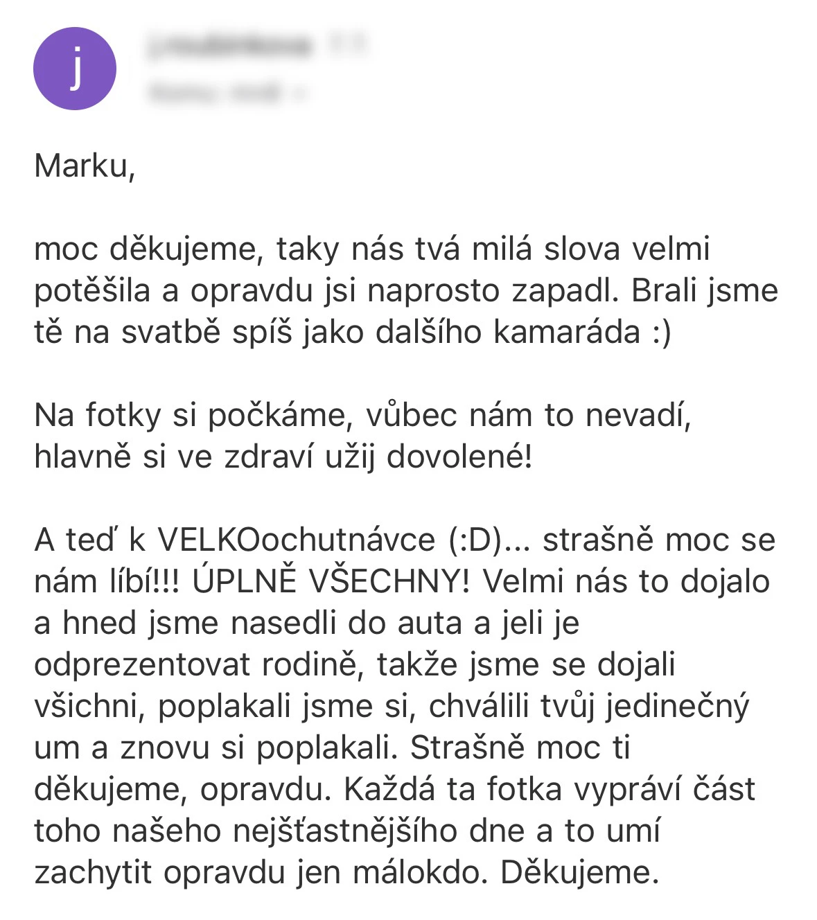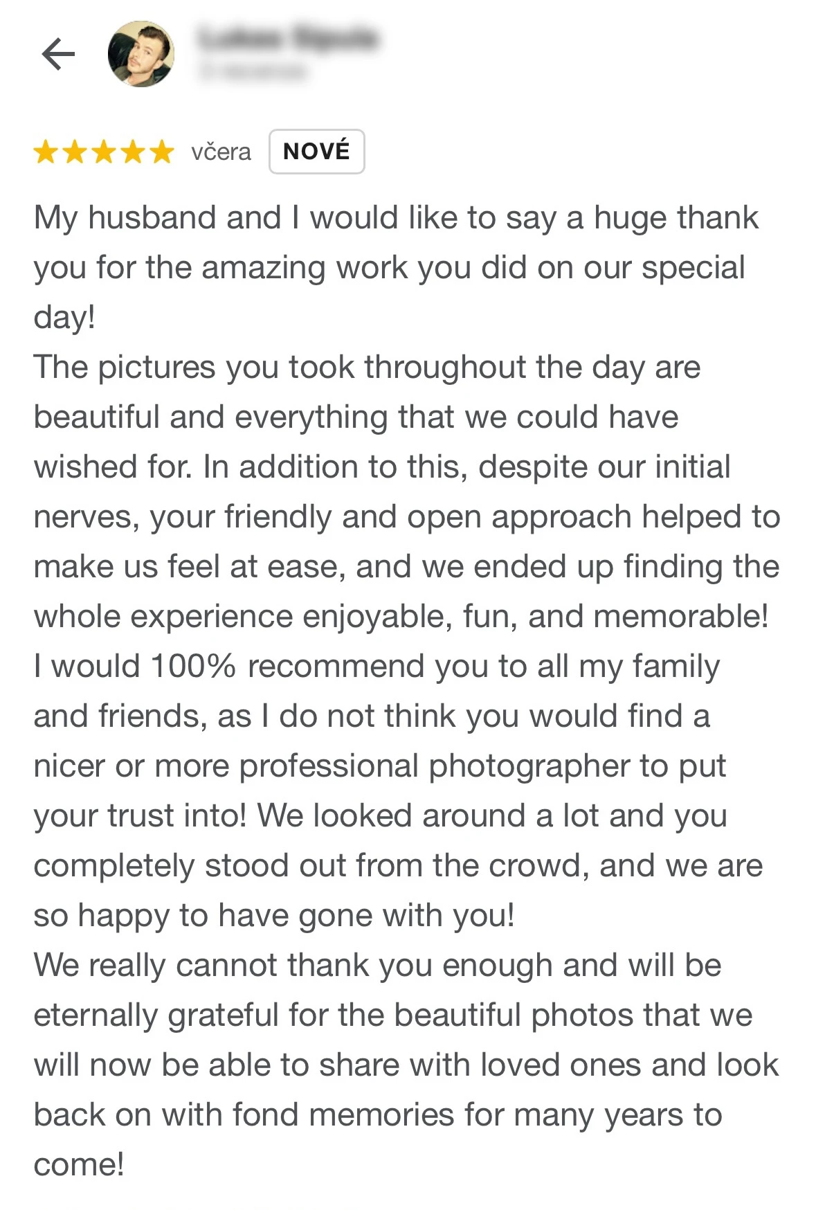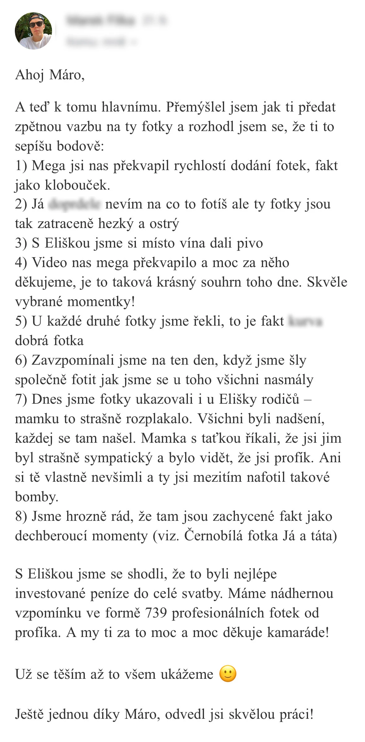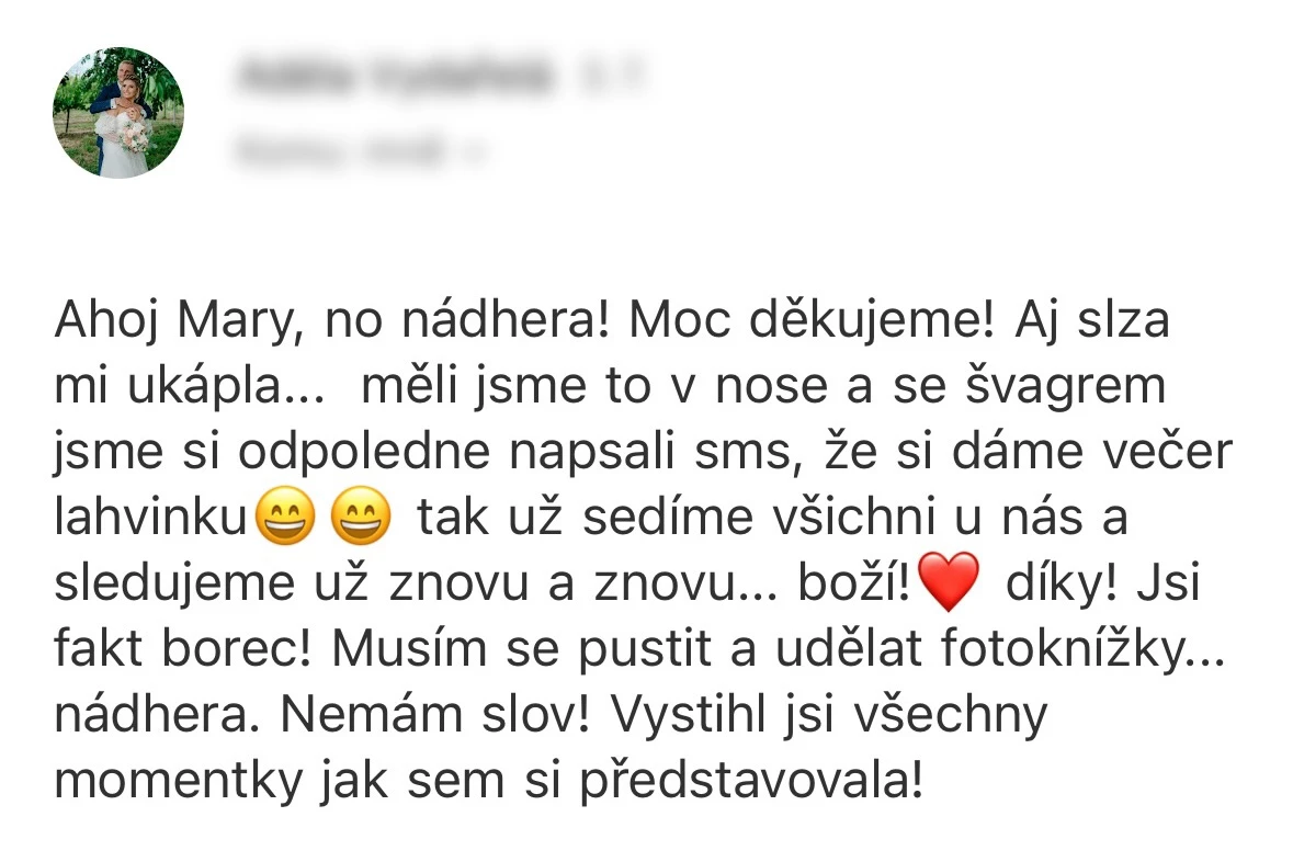 Fotky z naší svatby jsou přesně takové, jaké jsme si přáli – přirozené, emotivní a plné skutečných momentů. Díky nim se i po roce vracíme zpět ke všem těm krásným chvílím. Marek je navíc neuvěřitelně pohodový člověk, kterého jsme na svatbě vnímali spíš jako kamaráda než jako najatého profesionála – přestože jím bezesporu je. Vždy se snažil maximálně vyjít vstříc a byl nám velkou oporou. A jako krásná tečka přišla po čase i vzpomínková krabička – nádherný detail, který opravdu potěší. Doporučujeme z celého srdce, protože kdo si vybere Marka jako svého fotografa pro svůj velký den, rozhodně neudělá chybu!