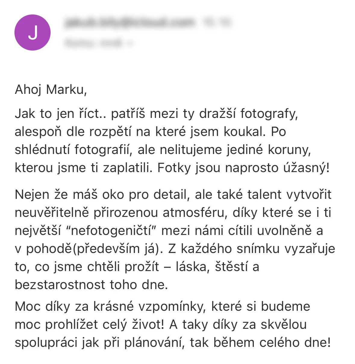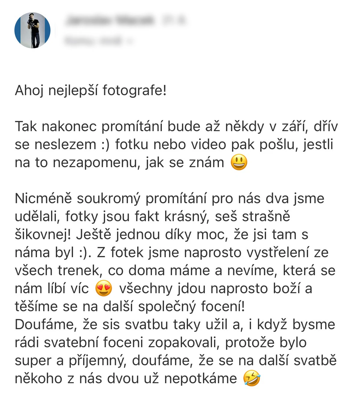 Fantastická domluva, kamarádský přístup, obrovský profesionál a především krásné fotky. Všem doporučuji!